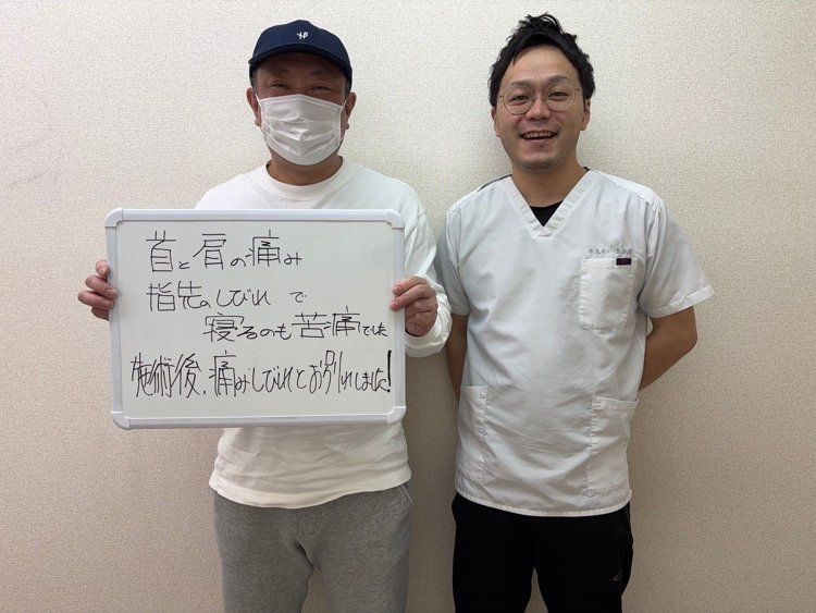 「首と肩の痛み、指先のしびれで寝るのも苦痛でした!施術後、痛み・しびれとお別れしました!」
