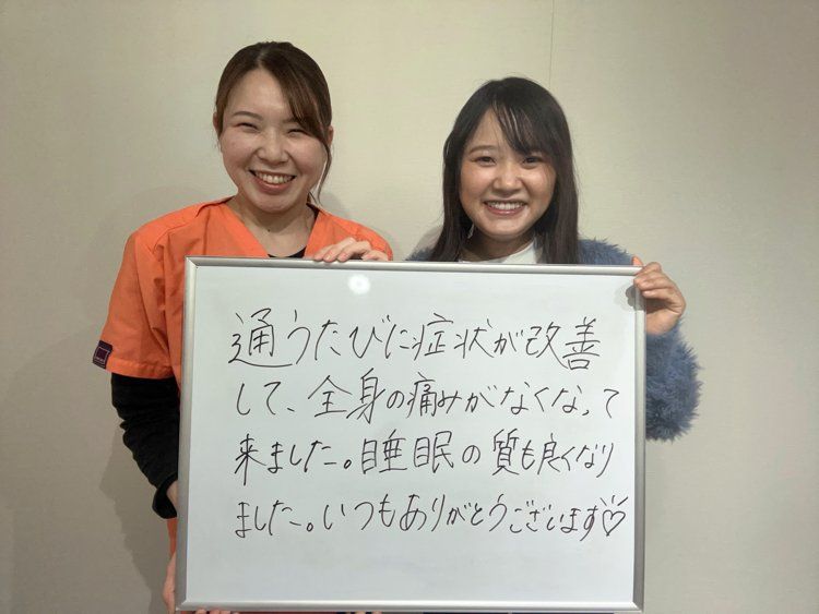 坐骨神経痛で通ってきましたが、お尻から背中から筋膜整体をうけてしびれも無くなり眠れるようになりました♡